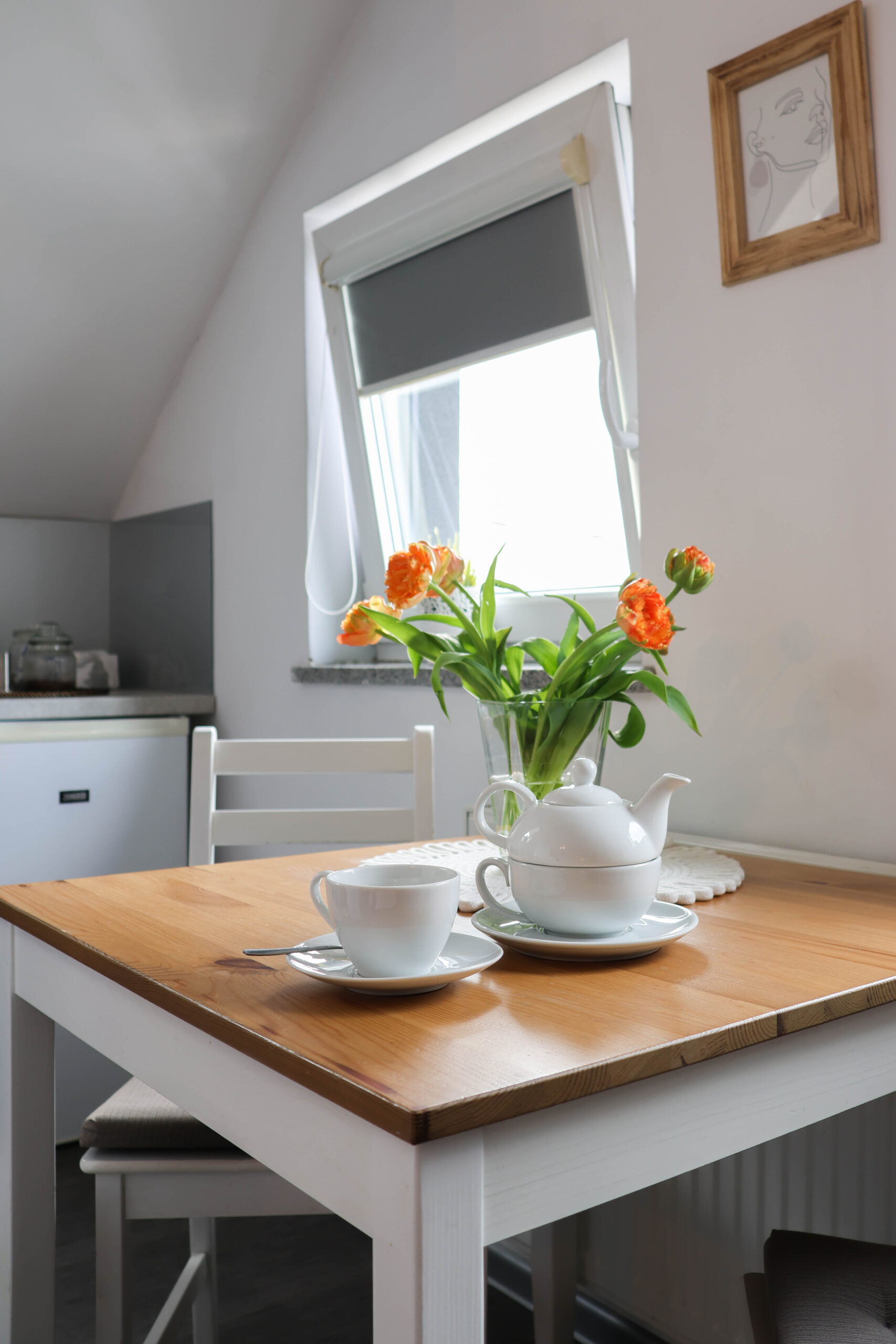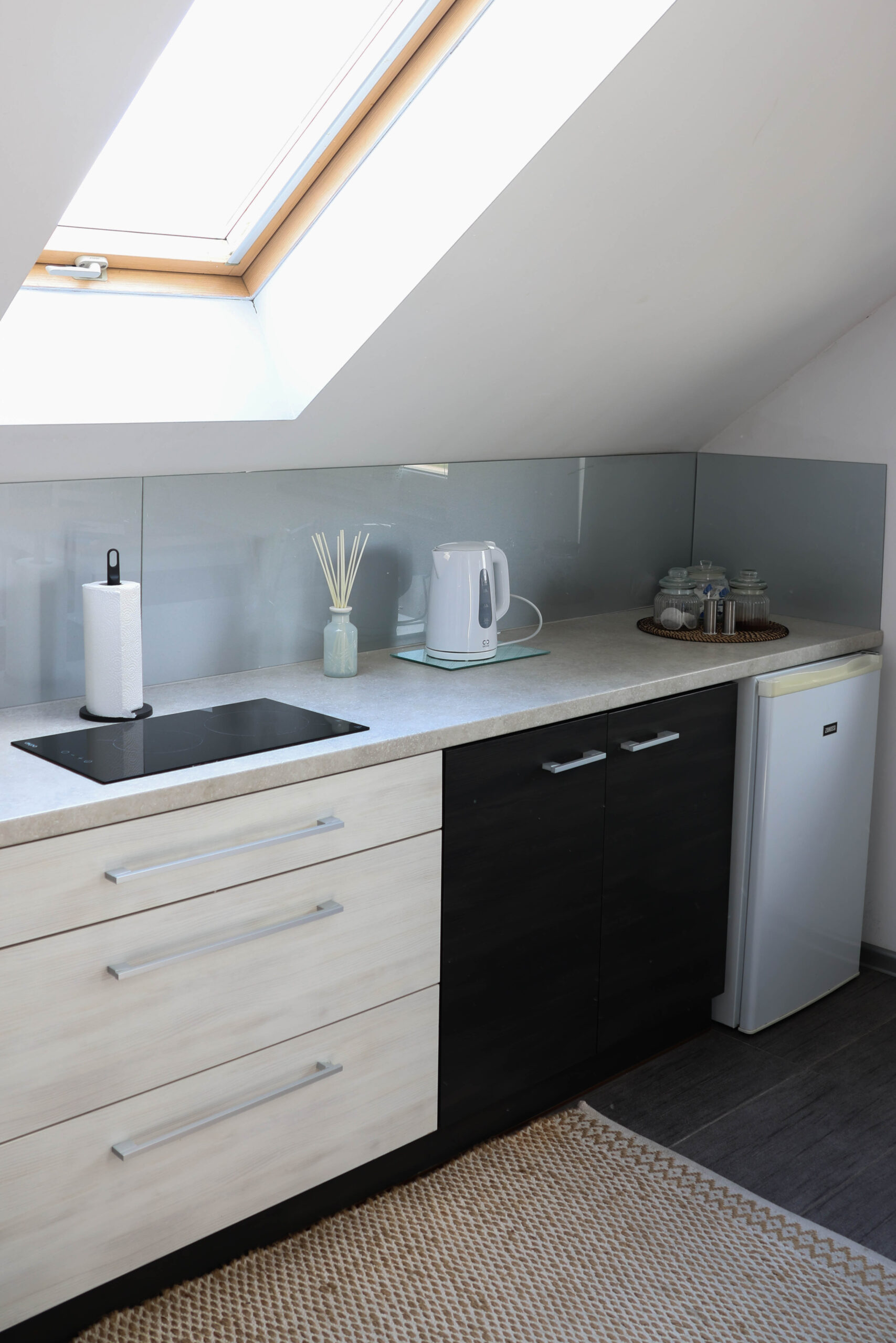 Apartament wyposażony jest w funkcjonalny aneks kuchenny z płytą grzewczą, czajnikiem elektrycznym i przestrzenią do przechowywania oraz spożywania posiłków – idealny dla osób, które chcą samodzielnie przygotowywać jedzenie. W części dziennej znajduje się telewizor z płaskim ekranem i kanałami satelitarnymi oraz stół jadalniany.